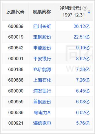 1997年,四川长虹净利润高达26.12亿,成为当时A股最赚钱的公司,排在长虹后面的是宝钢股份,当年的净利润是22.5亿。