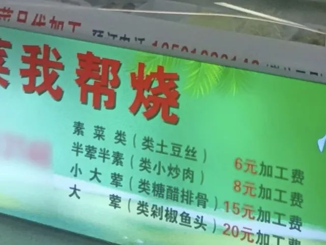 在菜市场,阿慧发现两家提供代炒服务的摊位,加工收费标准均10元起步,常见的荤素搭配家庭小炒只需10元,稍微复杂点的海鲜加工费也只有18元。