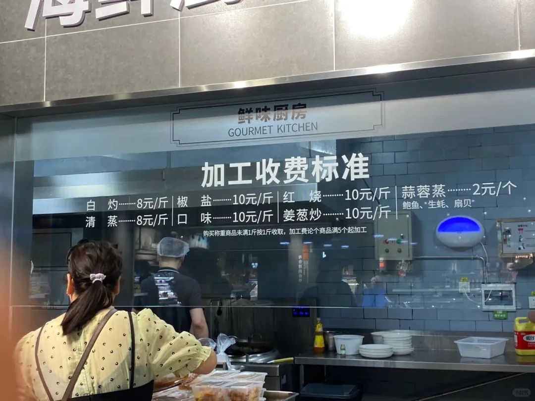 顾客在胖东来购买海鲜食材,可以在店内直接加工,并收取一定的加工费。清蒸、白灼等简单加工每斤收费8元,而爆炒、红烧复杂一些的则为10元每斤。
