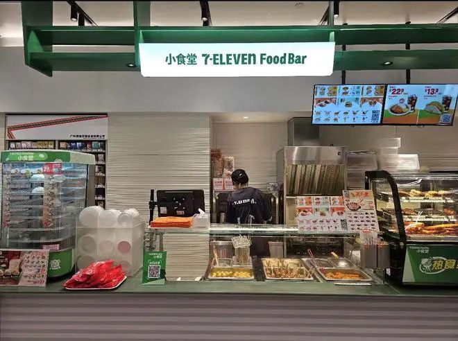 据红餐网报道,今年4月,7-Eleven在广州珠江新城星汇国际大厦开设一家小食堂,专门开辟出一块堂食区,售卖现制、现烤、现炸的食品,售价从6.9元—22.9元不等。