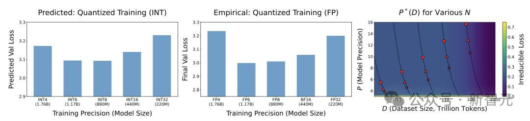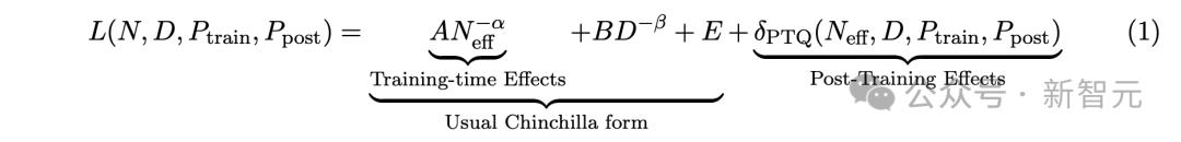 研究人员将之前提出的两个扩展法则合并成统一的函数形式,可以预测训练和训练后量化的影响,包括两者之间的相互作用。