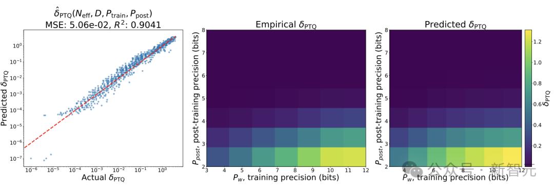 研究人员发现,在预测δPTQ时有两种竞争效应,但总体而言,以较低精度训练的模型对训练后量化更为健壮,即遭受的退化较小。