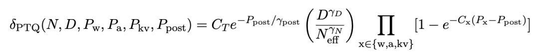 其中,A、B、E、α、β是正拟合常数,δ_PTQ是指推理前训练后量化引起的损失退化