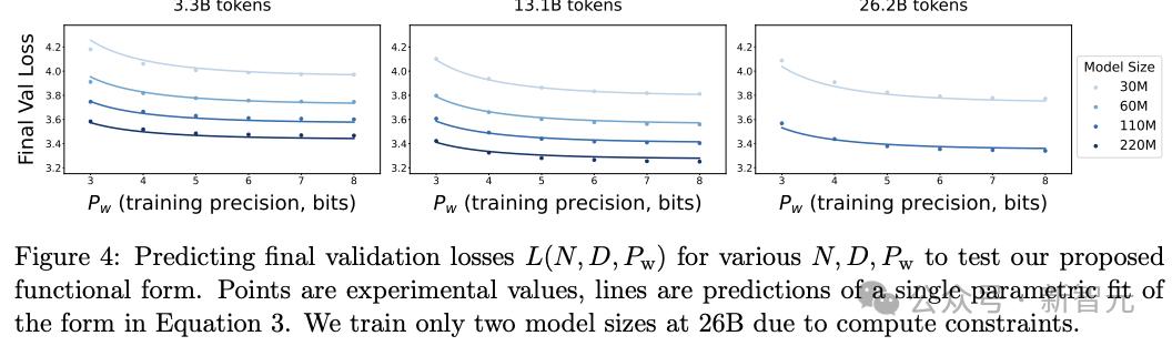 结果发现,当在整数类型的量化运行中拟合扩展法则时,P*大约是7位,也意味着在BF16中训练模型的实际操作可能是次优的,并且向低精度训练的竞争需要在低于4位之前停止,可能会迫使模型尺寸不成比例地(超过4倍)增大,从而保持住损失。