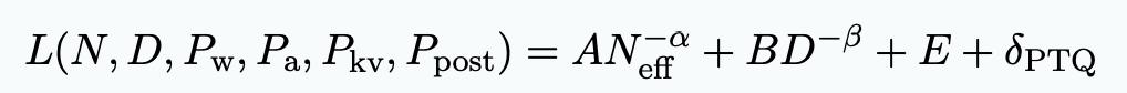 对于N个参数的语言模型,在D个token上进行训练,训练精度为P_train ,训练后权重精度为 P_post ,最终研究人员找到了一个统一的scaling law: