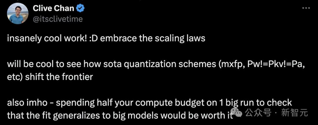 OpenAI研究员Clive Chan表示,拥抱scaling law,看看最先进的量化方案(mxfp,Pw≠Pkv≠Pa等)如何推进前沿将会很有趣。另外,我个人认为,值得花费一半的计算预算来进行一次大规模运行,以验证这个拟合是否适用于大模型。