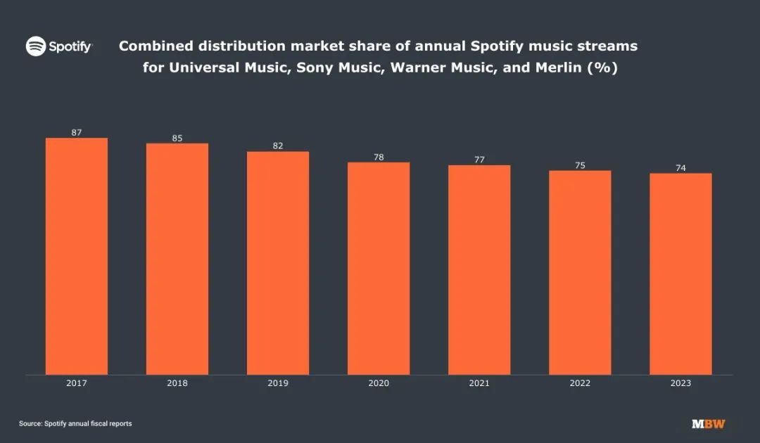 在流媒体进入增长瓶颈期后,独立音乐却迎来了自己的黄金期,间接削弱了传统音乐巨头的市场领导地位。数据显示,2023年,三大唱片以及独立音乐代理机构Merlin在Spotify上的音乐市场份额已经连续第6年下降,首次跌破74%,且整体成下滑趋势。