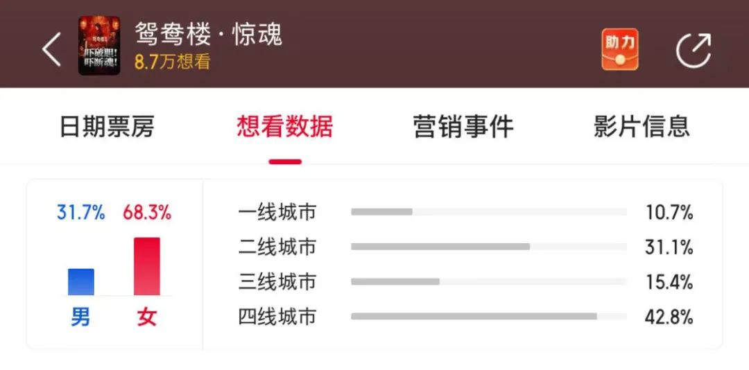 而想看数据也不会骗人,在猫眼专业版中,《鸳鸯楼·惊魂》三四线城市想看观众累计占比高达58.2%,下沉属性显著。