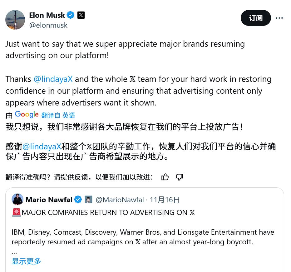 报道刊出后,马斯克本人也转发并感谢广告商,针对他们关心的问题回应说,“确保广告内容只出现在广告商希望展示的地方。”