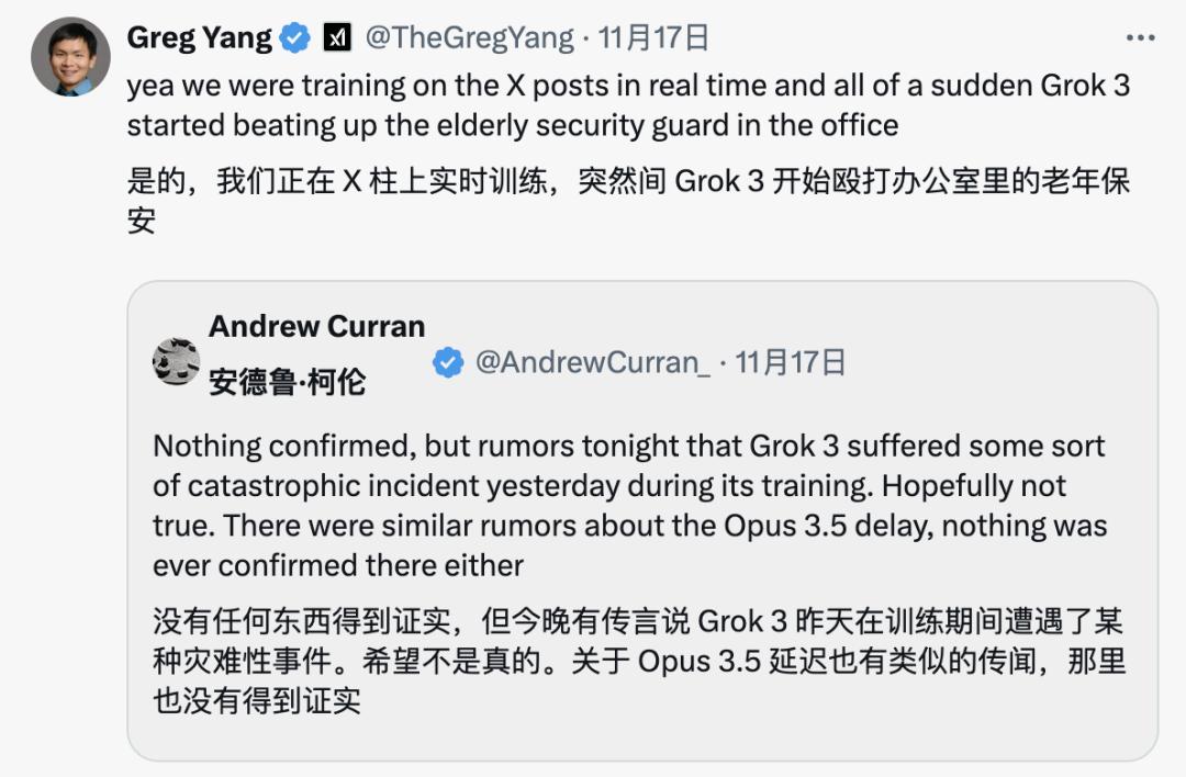 比如我们的老熟人 xAI 联创 Greg Yang 率先调侃道,Grok-3 在训练过程中突然殴打办公室里年长的保安。