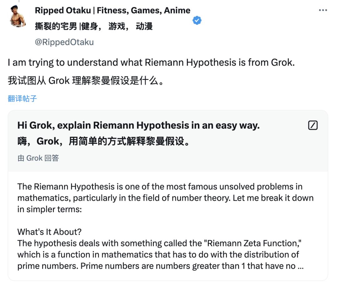 当然,更理性的网友直接在 X 上询问当前版本的 Grok 对黎曼猜想的理解。