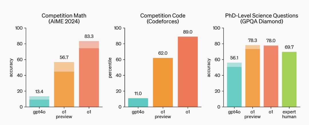 所以在今年美国针对优秀高中生的 AIME 测验当中,GPT-4o 仅完成了 13% 的题目。相比之下,o1 的正确率高达 83%。