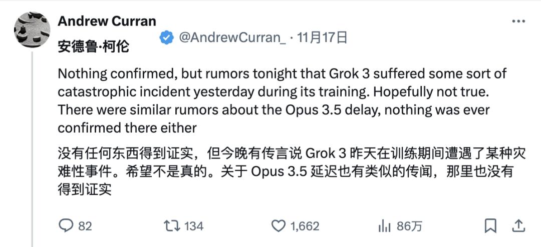 事情的源头大概要追溯到网友 Andrew Curran 更早些时候的一则「爆料」,其 声称 Grok-3 在训练过程中发生了灾难性事件。