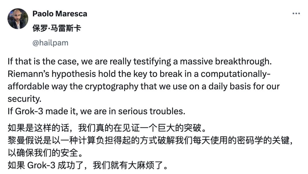 所以我们会看到不少海外网友为 Grok-3 证明黎曼猜想欢呼,「如果是这样的话,我们真的在见证一个巨大的突破。」