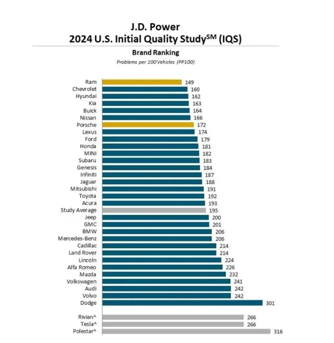基于2024年近10万名购车或租车用户的数据,《2024美国新车质量研究(IQS)》显示,燃油车平均每100辆车出现180个问题,而纯电动汽车的问题数高达266个,超出燃油车86个。