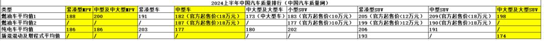 既如此,就需要引入第三个榜单:中国汽车质量网发布的2024上半年中国汽车质量排行。该榜单以平均值的形式对汽车质量进行排行,排除了燃油车庞大的保有量基数可能带来的影响。