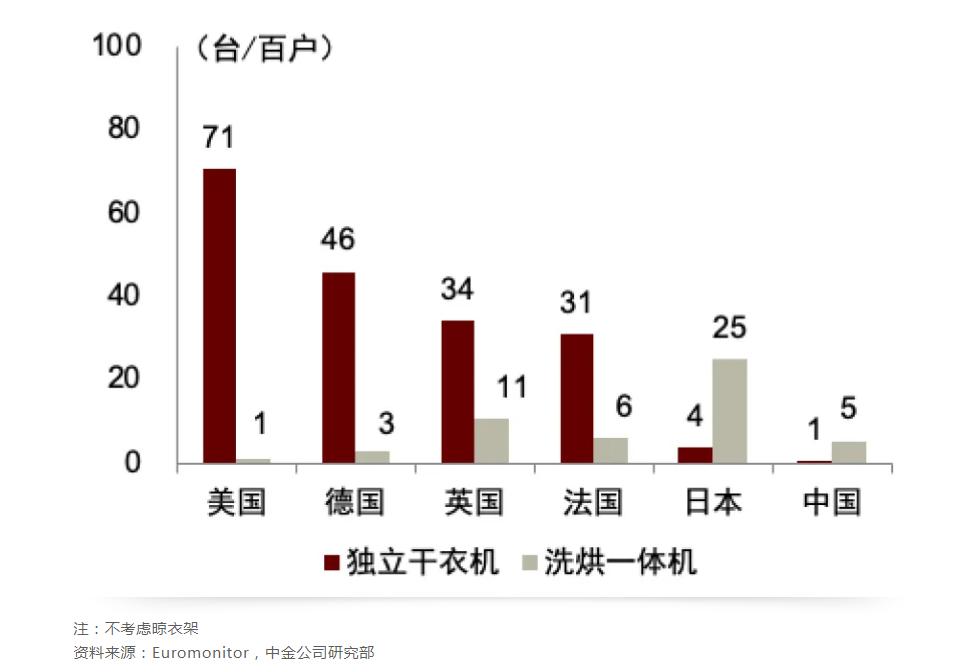 数据显示,在美国每百户干衣机的拥有量将近80台,在英法德也在40台左右,日本是39台,但中国竟然只有区区6台。