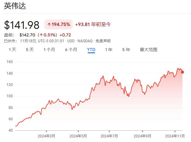自今年年初以来,英伟达股价在AI浪潮的推动下已上涨近两倍,截至周五收盘时达到141.98美元/股。