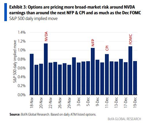 因此,英伟达三季报可能会决定市场的短期方向,特别是在选举后的市场休整期间,英伟达的财报成为市场关注的焦点。期权市场数据显示,市场对英伟达财报的反应比对下月的非农、CPI和FOMC利率决议更为敏感,表明英伟达财报对市场的影响可能超过其他经济事件。