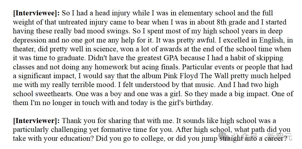 听完被试的高中经历后,ta会贴心地进行总结,然后继续提问:「谢谢你与我分享这些。听起来高中对你来说是一个特别有挑战性、但成长很多的时期。高中毕业后,你选择了怎样的道路?是去上了大学还是直接进入职场了呢?」