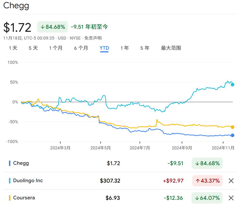 刚刚发布的2024年三季报,Chegg的收入下降13.5%,营业利润率为-163%,仅靠教科书租赁业务苦苦支撑。