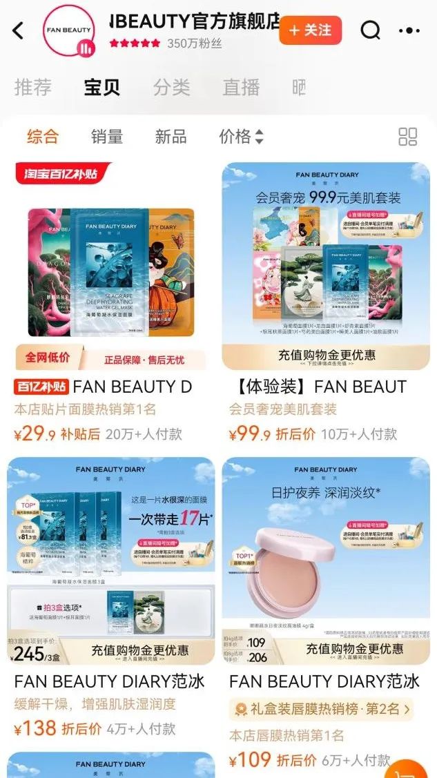 Fan Beauty在国内更是取得了一个又一个好成绩,该品牌创立的第二年即2019年双十一,便在1小时成交额达到了4000万。公开资料显示,Fan Beauty在2021年GMV就已超3亿、2022年GMV超8亿、2023年GMV超11亿。目前,天猫Fan Beauty旗舰店粉丝量为350万,月销超100万件宝贝,有28款产品链接超万人付款。