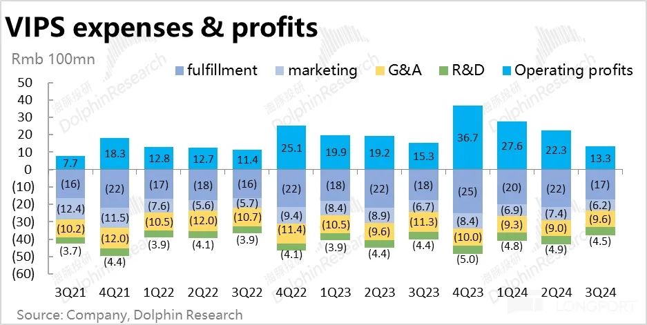 增长端在 GMV、收入、毛利上唯品会的表现都不乐观,因此控费基本是守住利润增长的最后防线。与京东、阿里等大平台本季营销支出同比有明显的增长不同,唯品会本季的经营支出大多数仍是同比下降的。本季四项经营费用整体支出 38 亿,同比下降 6%。其中,营销费用支出为 6.2 亿,同比减少了 8%。面对头部平台增加补贴吸引用户,唯品会并未选择正面应战,一定程度上接受了摇摆用户的流失,更多专注在了核心的如 SVIP 用户上。