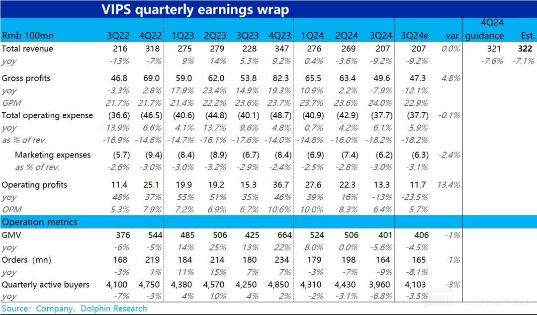 北京时间 11 月 19 日美股盘前,$唯品会.US 发榜了 2024 年 3 季度财报,概括来看收入和经营利润双双约 10% 上下的下滑,业绩表现无疑较差,但市场对此已充分预期,详细要点如下: