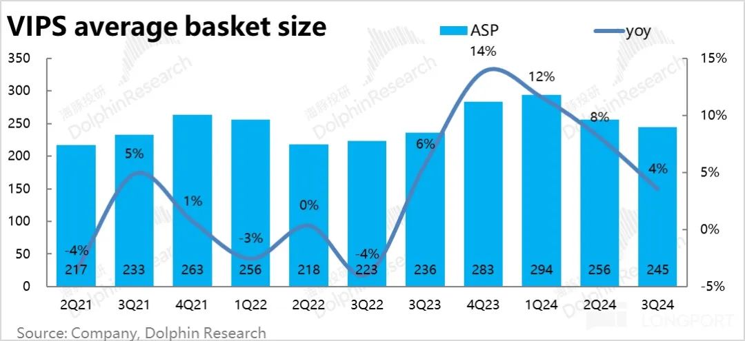 过去几个季度一直起对冲用户和单量下滑的客单价走高幅度,本季度下降到了 4%。一方面,去年 3Q 时客单价基数已有抬升,基数红利消退。另外价格补贴,行业竞争,和高单价的冬装等销售不佳都可能是客单价提升幅度缩窄的原因。