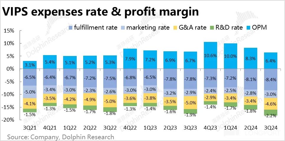4、与京东、阿里等大平台本季营销支出同比有明显的增长不同,唯品会本季的经营支出大多数仍是同比下降的。本季四项经营费用整体支出 38 亿,同比下降 6%。其中,营销费用支出为 6.2 亿,同比减少了 8%。面对头部平台增加补贴吸引用户,唯品会并未选择正面应战,一定程度上接受了摇摆用户的流失,更多专注在了核心的如 SVIP 用户上。其他费用中,仅有研发费用是同比增长的 (4%),大概率是因为公司在 AI 导购、试装等功能上投入的影响。但由于收入同比 9% 的萎缩,四项营费用率合计仍是被动增长的,从-17.6% 增加到了-18.2%。