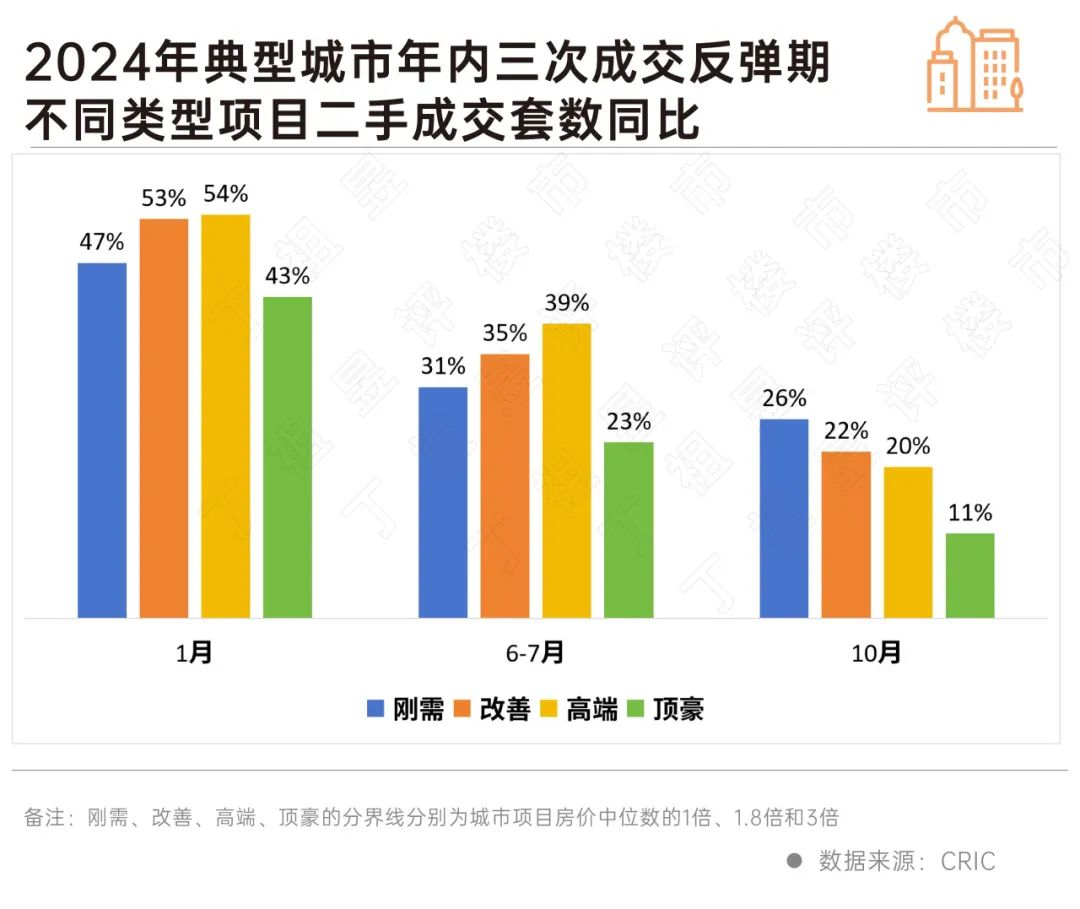 基于此,我们可以看出,10月二手房同比增速回升放缓很大程度上受改善、高端和顶豪类项目增速下降影响。