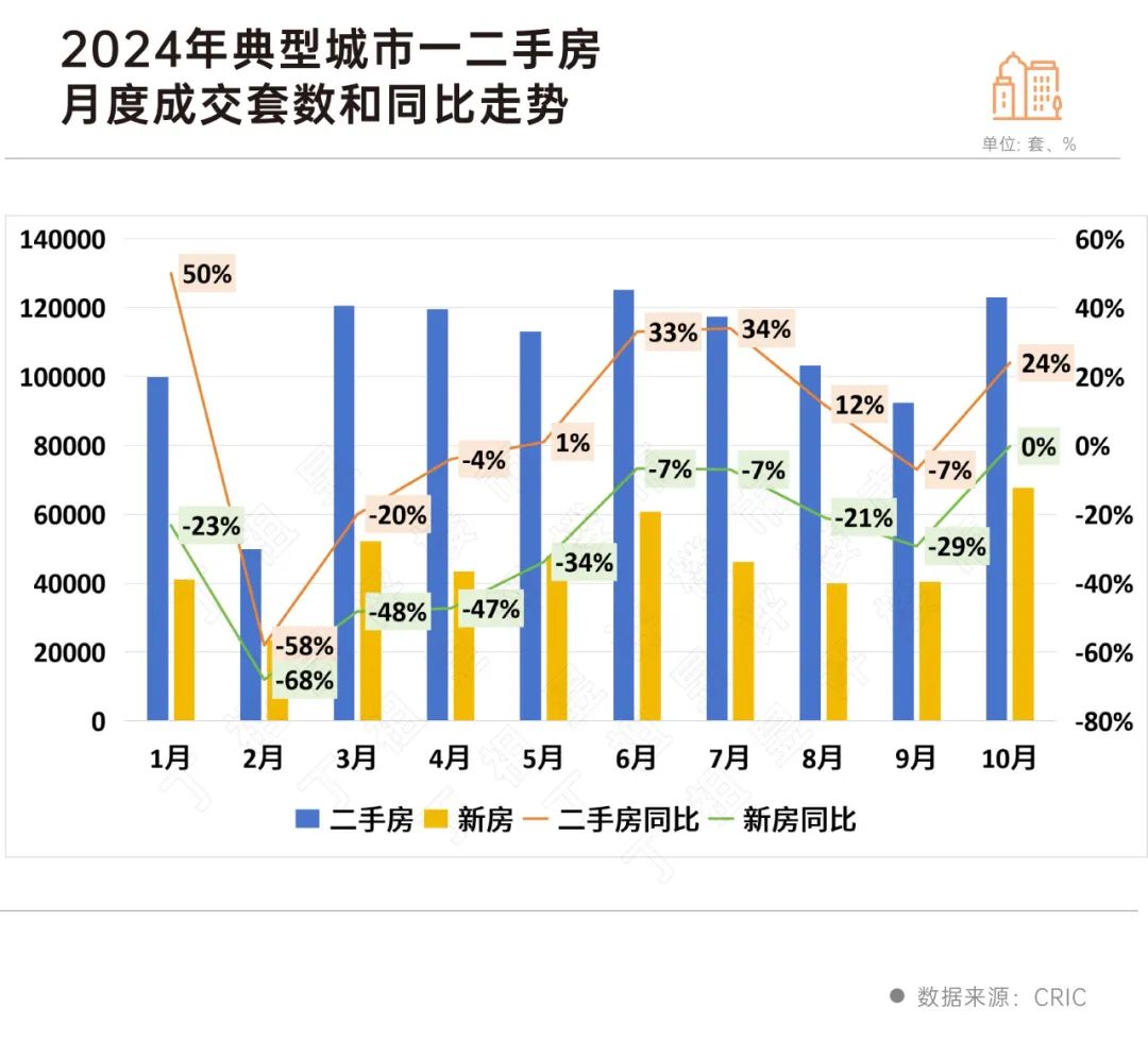 CRIC监测的重点城市10月二手房成交规模同比增加24%,新房成交规模年内首次止跌。