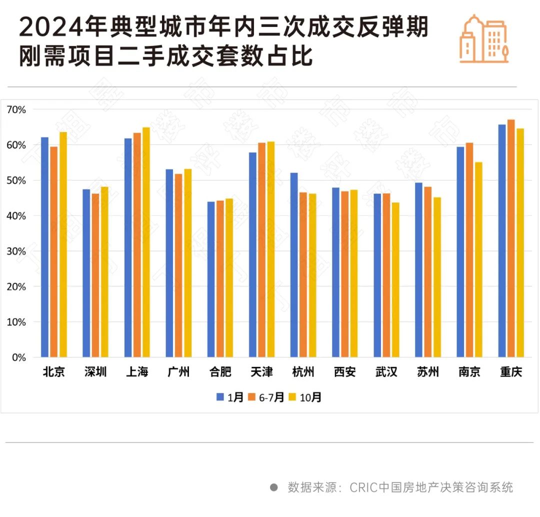 在年内三次反弹期中,刚需项目成交占比均在小幅稳步提升,10月份刚需类新项目平均成交占比51%。