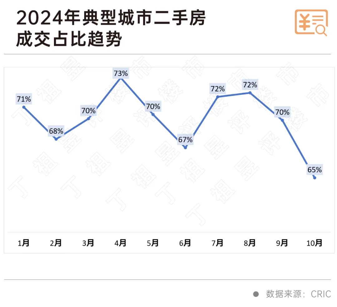 从新房和二手房市场份额进一步来看,10月,重点12城二手房成交份额占比为65%,较9月下降5个百分点,并且成交份额降至年内各月最低水平。