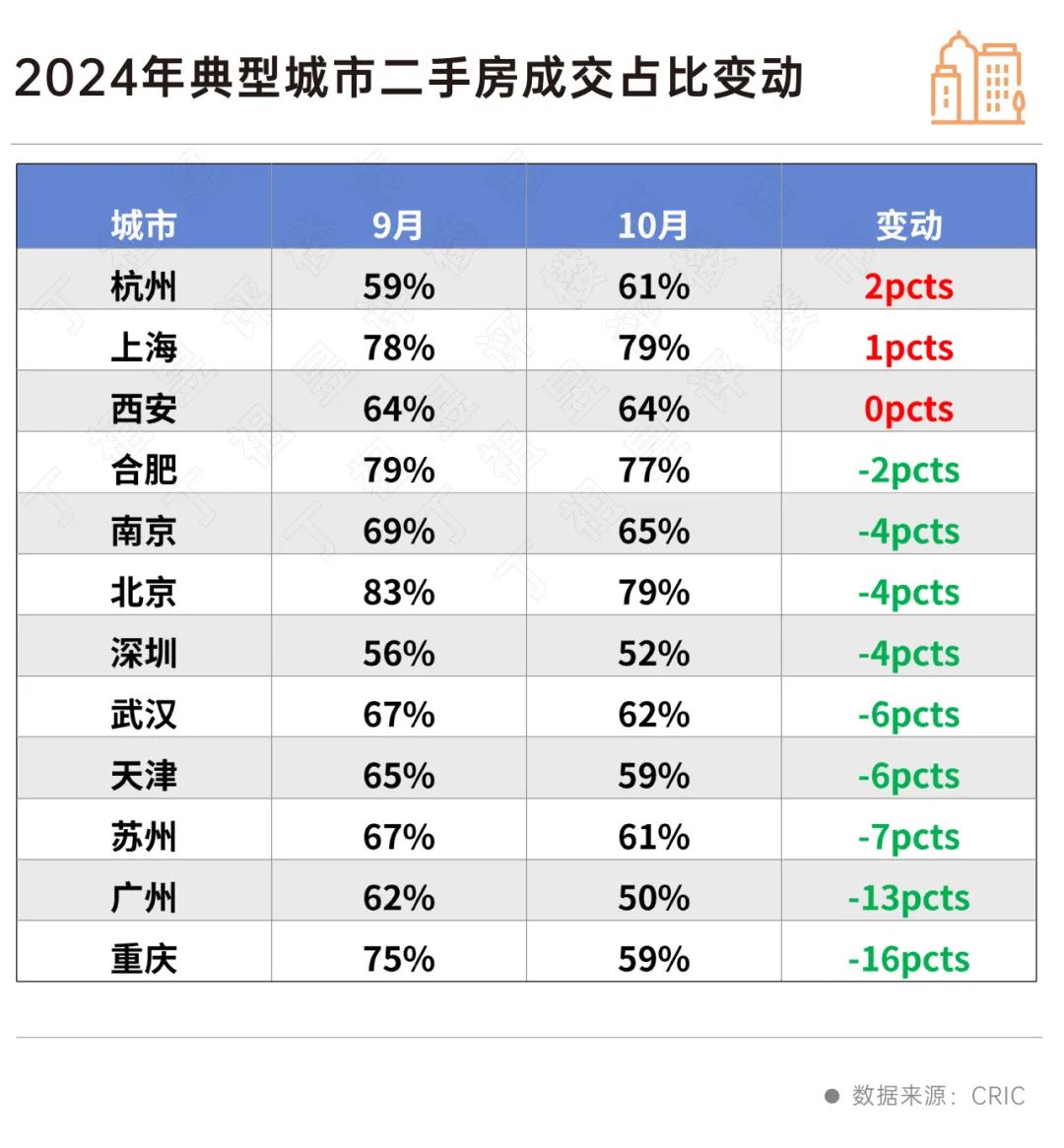 从城市表现来看,2024年10月,多数城市二手房成交占比出现下降。