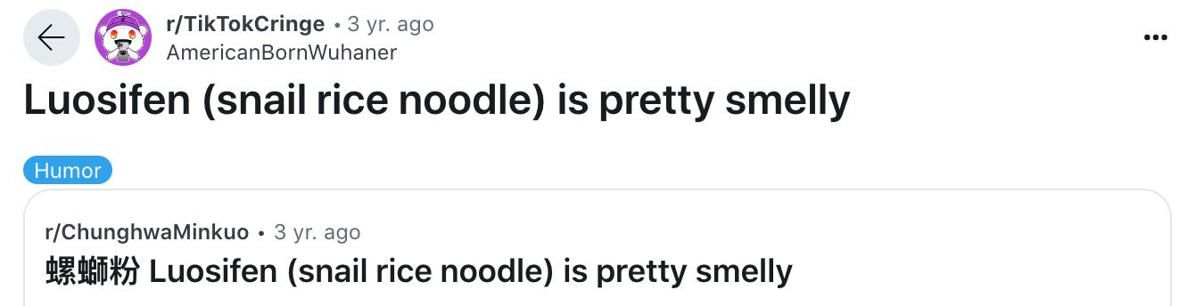 从2020年直播电商兴起,螺蛳粉火遍国内外,尽管如今螺蛳粉的外语翻译仍未统一,但是不妨碍海外留学生、甚至外国人在社交平台上嗮出自己吃螺蛳粉的快乐体验。