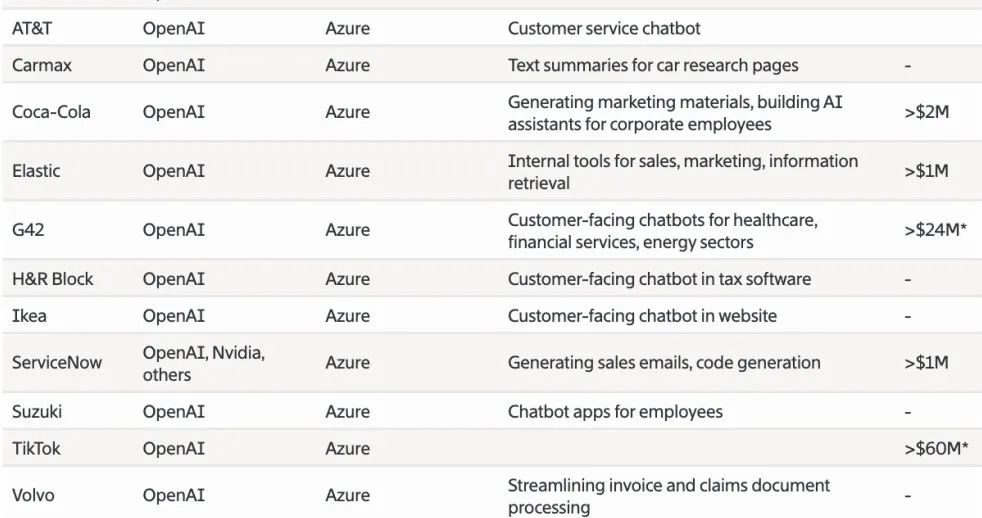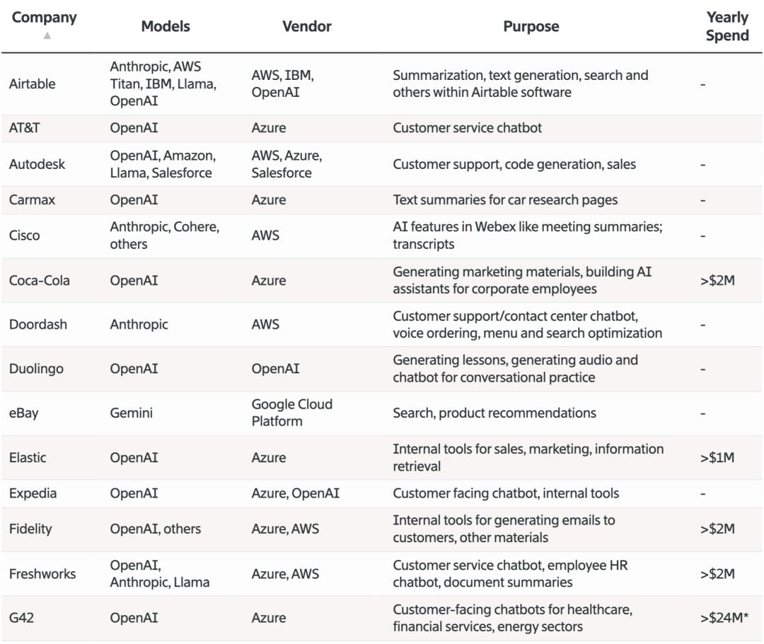 The Information梳理了50家企业如何使用生成式AI技术,底层AI模型供应商(Model)、AI模型应用平台(Vendor)以及对生成式AI的年投入资金(Yearly Spend)等情况。