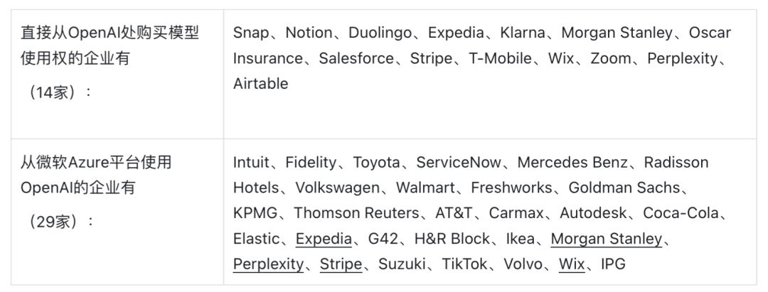 Expedia、Morgan Stanley、Stripe、Perplexity和Wix 5家企业从OpenAI处购买了其API接口服务后,仍选择从微软Azure平台购买服务。可以从一定程度看出,微软Azure平台在AI模型应用和服务方面颇受企业信任。