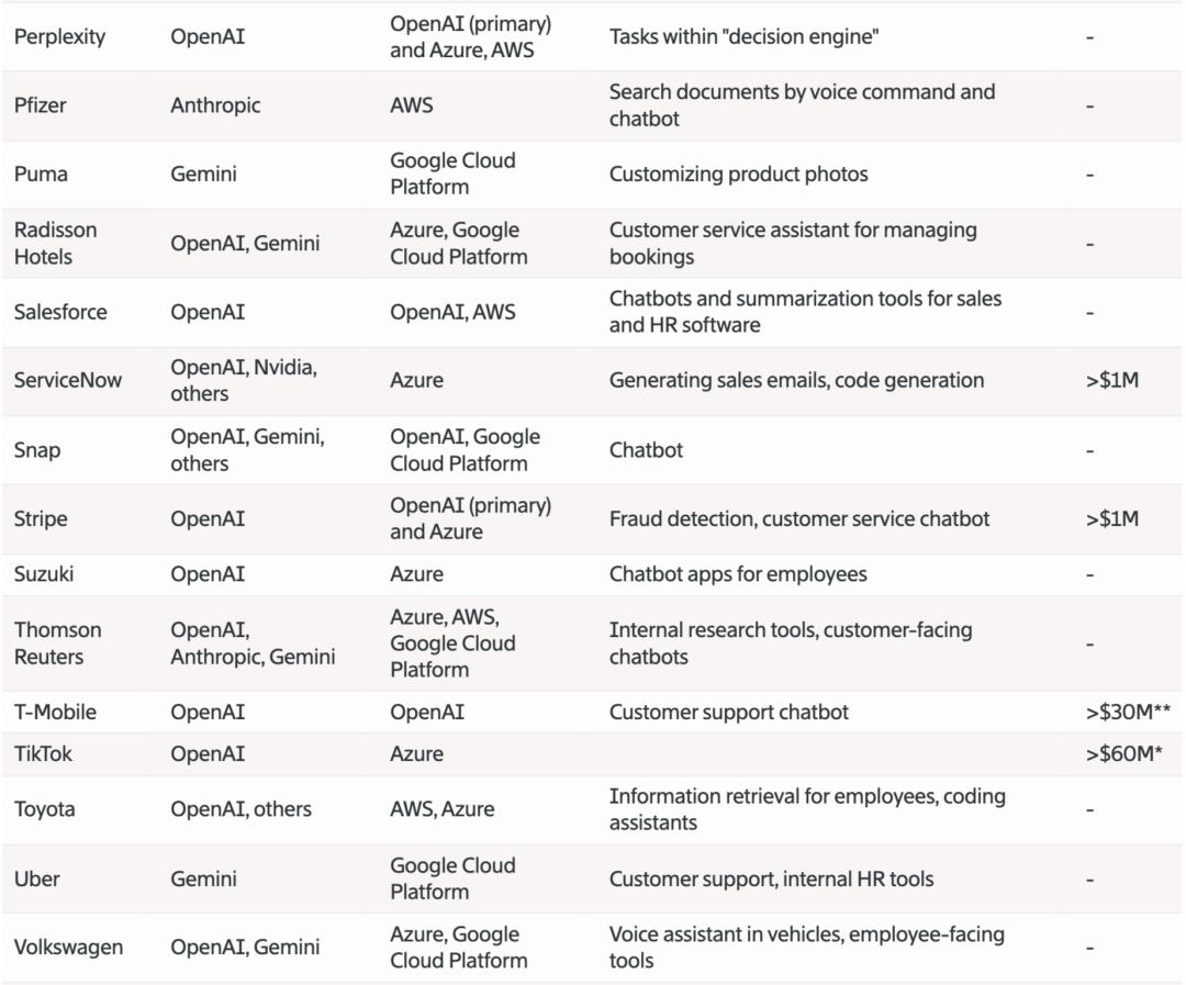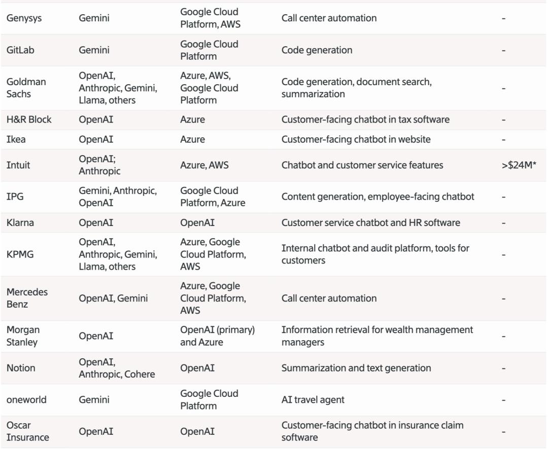 多样产品组合下,部分公司选择仅采购某一家模型,而有些大公司如Uber、AT&T等不但购买了模型公司的企业级产品,同时还在云平台调用多种企业模型以服务其多样的产品。