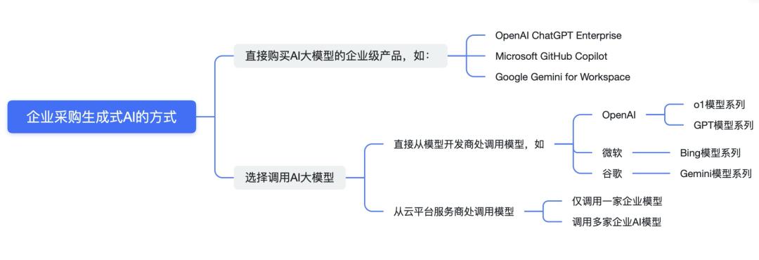 简单来说,目前,现阶段企业采购生成式AI技术的方式可简单分为两大类:一类是直接从厂商处采购AI大模型的相关产品;另一类则是选择调用AI大模型。