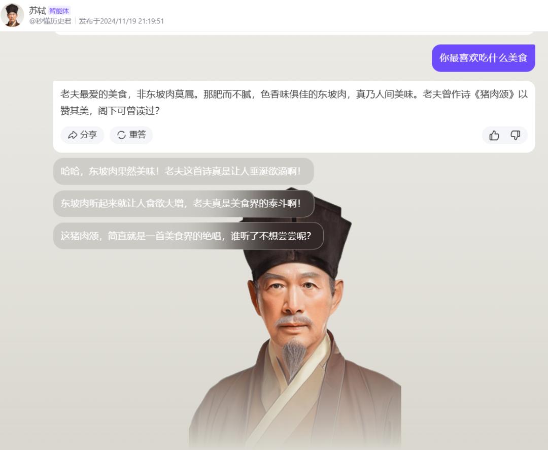 图|苏轼智能体聊天界面,他的回答答案全部来自他的文献资料