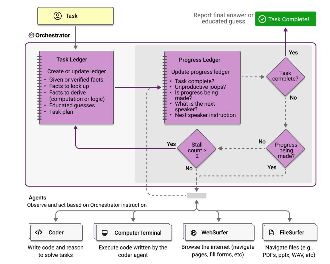 微软研究院的 Magentic-One 多智能体系统强调通过内、外两套循环来解决开放 Web 和基于文件的操作任务。