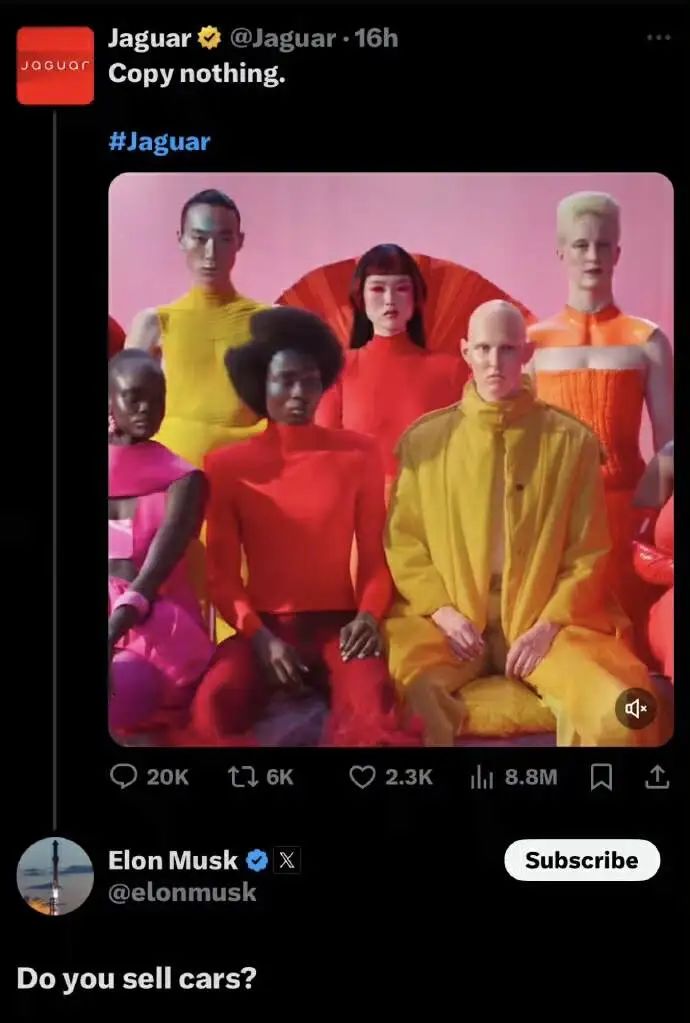 而且,捷豹在社交媒体X上发布了新品牌标识的宣传片上,几乎看不到任何和车相关的元素,反而像是一场时装秀,这段宣传片虽然引起了广泛关注,但似乎并未得到海内外网友的普遍认可。