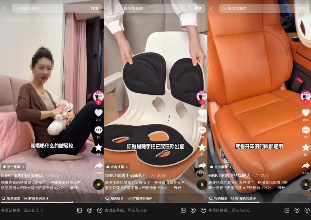 据观察,BKT在内容营销中非常注重对产品可以随时随地使用的特点。比如让喜欢玩手机女生展示BKT在葛优躺时的使用方式,让母婴博主强烈推荐哺乳期宝妈如何省腰,让久坐的上班族介绍如何将办公椅变得像窝在沙发一样舒适等,而同一个达人也会强调,这个产品还可以“开车坐、开会坐、随时随地坐”。