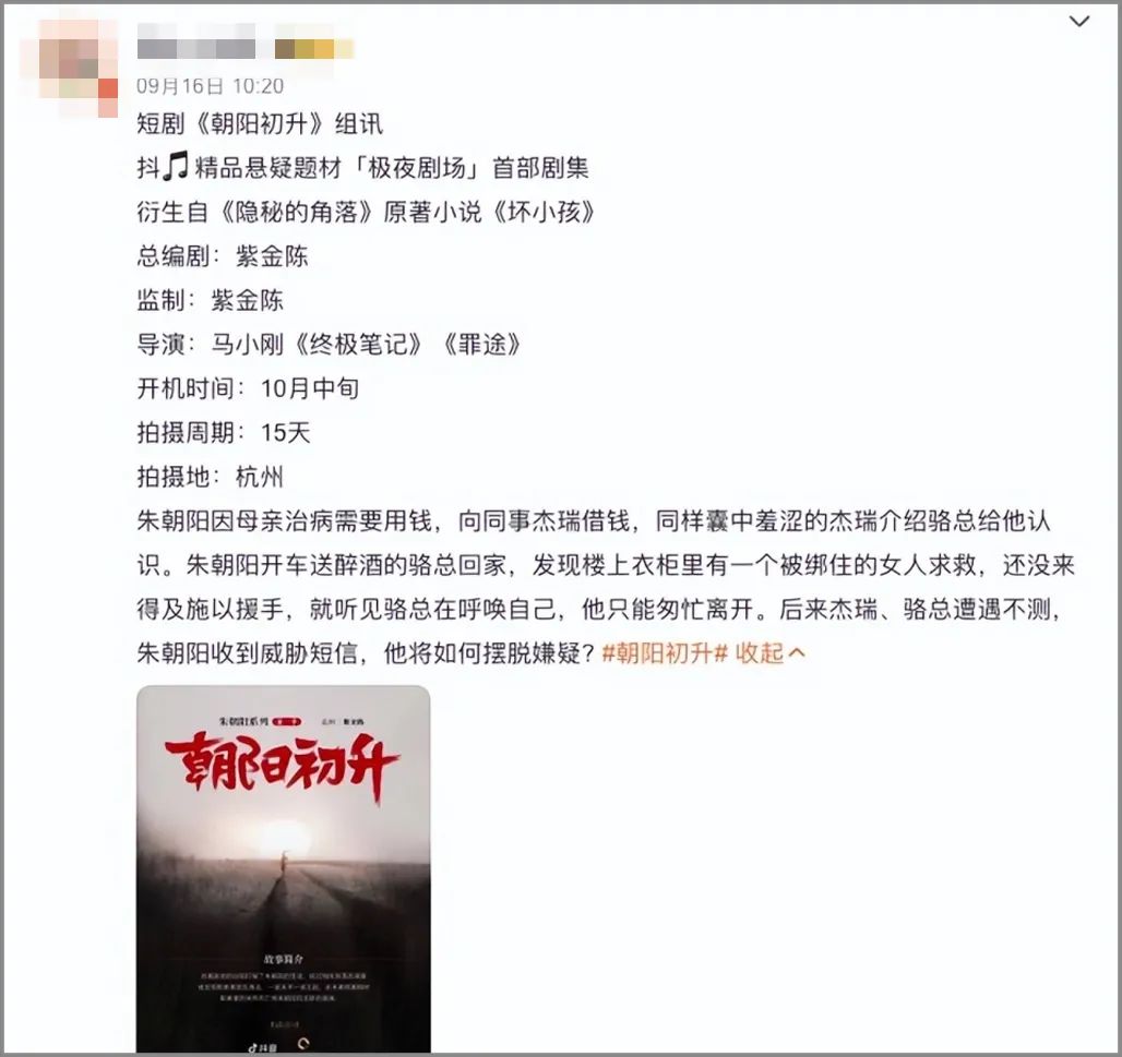像是抖音“极夜剧场”首部作品《朝阳初升》就被宣传为之前“迷雾剧场”剧集《隐秘的角落》的衍生微短剧,紫金陈担任总编剧及监制,多位参与过剧集《隐秘的角落》的原班人马也将参与本次短剧版的制作。如果说短视频平台都已经意识到了这种衍生联动的重要性,长视频还在等什么呢?