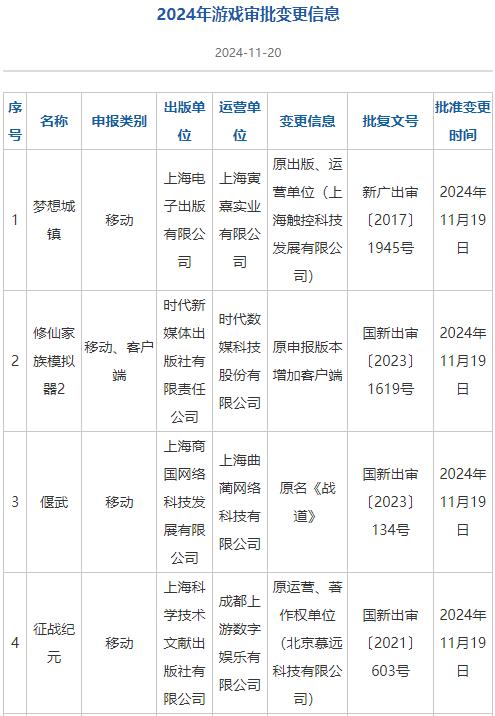 11月共有4款游戏申请版号信息变更成功。其中,时代数媒的《修仙家族模拟器2》增报客户端,曲蔺网络的《战道》更名为《偃武》。