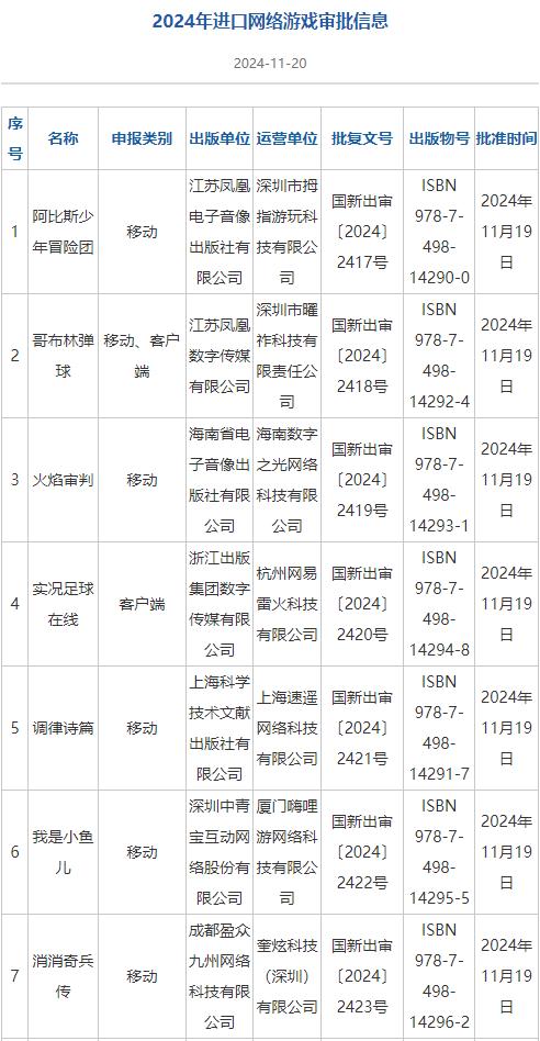 本月获批版号的7款进口游戏中,网易雷火的《实况足球在线》为纯客户端产品,曜祚科技的《哥布林弹球》为移动、客户端双端,其余5款均为移动游戏。