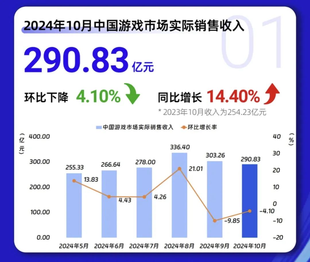 2024年10月,中国游戏市场实际收入同比增长14.40%
