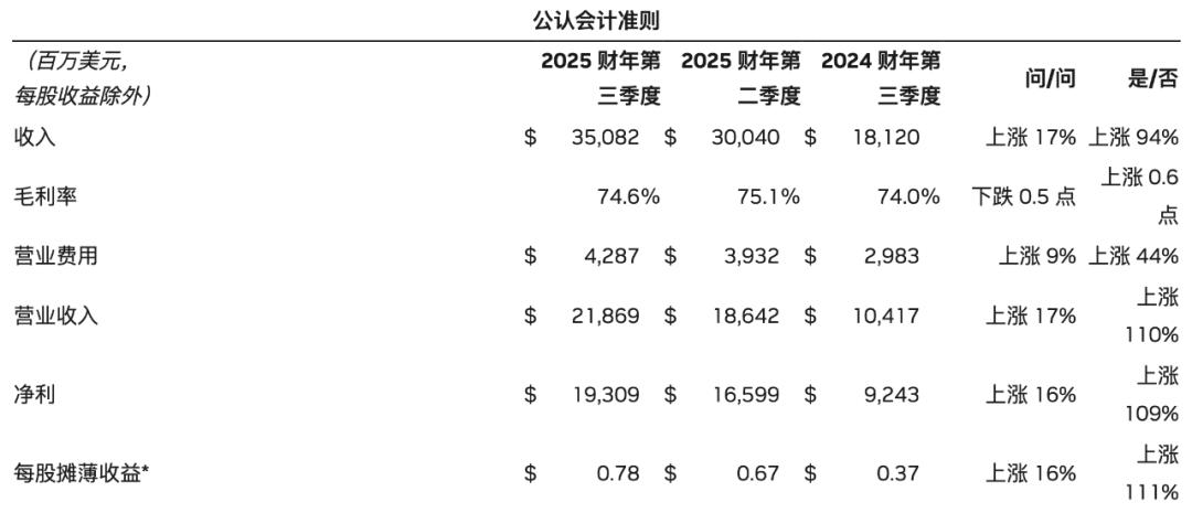 数据显示,英伟达第三财季营收为350.8亿美元,同比增长94%;净利润为193.09亿美元,同比增长109%,均超出市场预期。