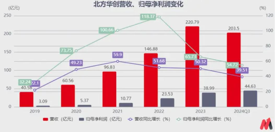 从2024年前三季度来看,北方华创实现营业收入203.53亿元,同比增长39.51%;归母净利润44.63亿元,同比增长54.72%;扣非净利润42.66亿元,同比增长61.58%,显示出强劲的增长势头。